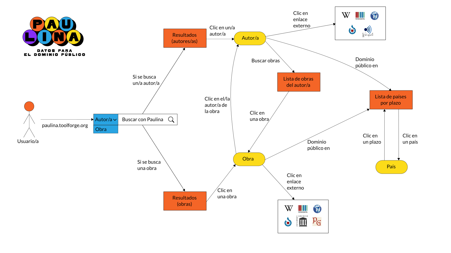 Paulina es una aplicación web que sirve para buscar autores/as y obras, acceder a las obras cuando están disponibles y conocer si están o no en dominio público. Funciona tanto para el patrimonio cultural de Uruguay como de cualquier otro país. La aplicación toma los datos de Wikidata, la enorme base de datos colaborativa del movimiento Wikimedia, y los presenta de una manera amigable. Permite hacer búsquedas por autor/a, por obra, y conocer los plazos de derecho de autor de todos los países. También invita a las personas usuarias a aportar datos cuando estos faltan o tienen errores. En estos momentos el trabajo en Paulina está centrado en la incorporación de filtros de búsqueda, lo que va a potenciar enormemente su utilidad permitiendo consultas avanzadas. El nombre del proyecto es un homenaje a la autora y activista feminista uruguaya Paulina Luisi (cuyas obras están en dominio público y en gran medida digitalizadas).