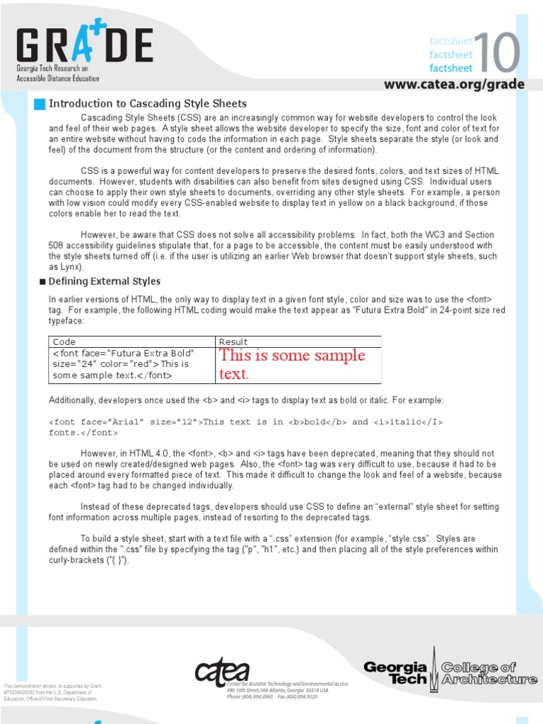 Cascading Style Sheets (CSS) are an increasingly common way for website developers to control the look and feel of their web pages. A style sheet allows the website developer to specify the size, font and color of text for an entire website without having to code the information in each page. Style sheets separate the style (or look and feel) of the document from the structure (or the content and ordering of information). CSS is a powerful way for content developers to preserve the desired fonts, colors, and text sizes of HTML documents. However, students with disabilities can also benefit from sites designed using CSS. Individual users can choose to apply their own style sheets to documents, overriding any other style sheets. For example, a person with low vision could modify every CSS-enabled website to display text in yellow on a black background, if those colors enable her to read the text. However, be aware that CSS does not solve all accessibility problems. In fact, both the WC3 and Section 508 accessibility guidelines stipulate that, for a page to be accessible, the content must be easily understood with the style sheets turned off (i.e. if the user is utilizing an earlier Web browser that doesnt support style sheets, such as Lynx).