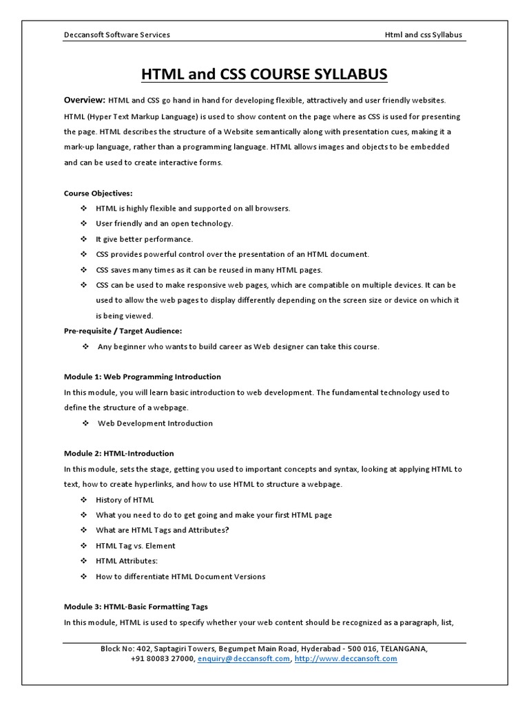 HTML and CSS COURSE SYLLABUS