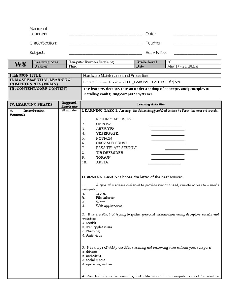 Learning Area Computer Systems Servicing Grade Level 10