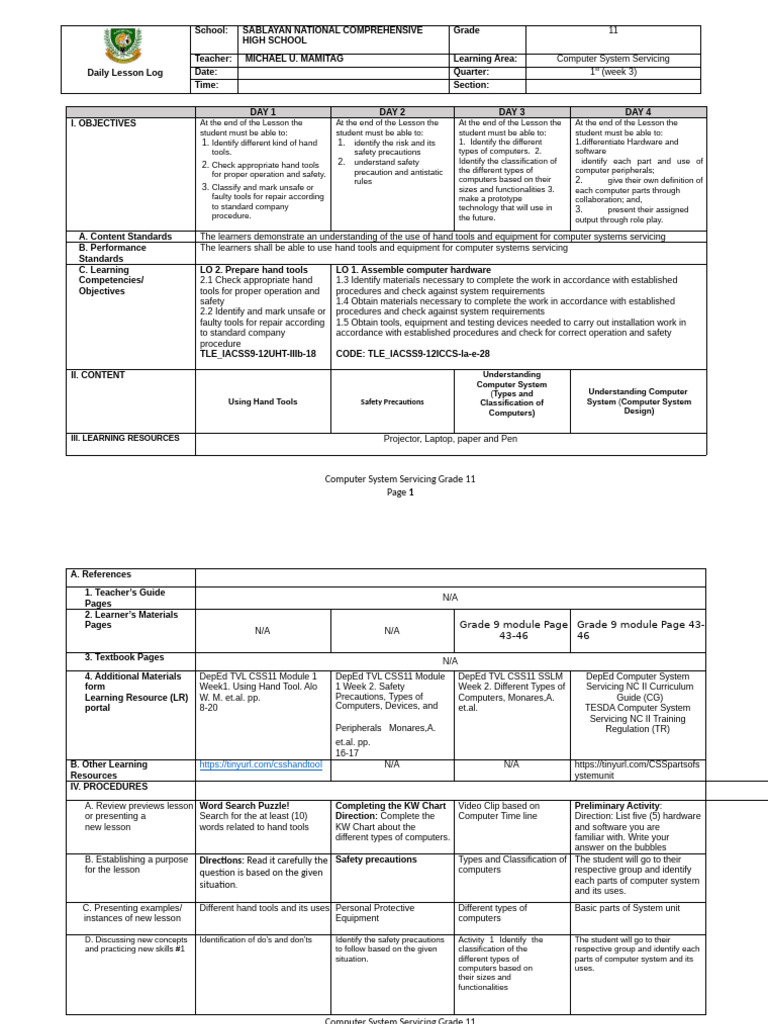 Teacher: MICHAEL U. MAMITAG Learning Area: Computer System Servicing