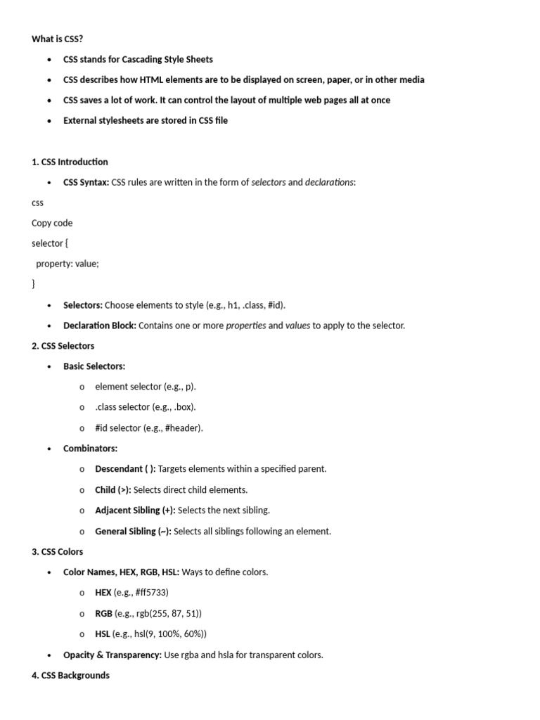 Opacity & Transparency: Use rgba and hsla for transparent colors.