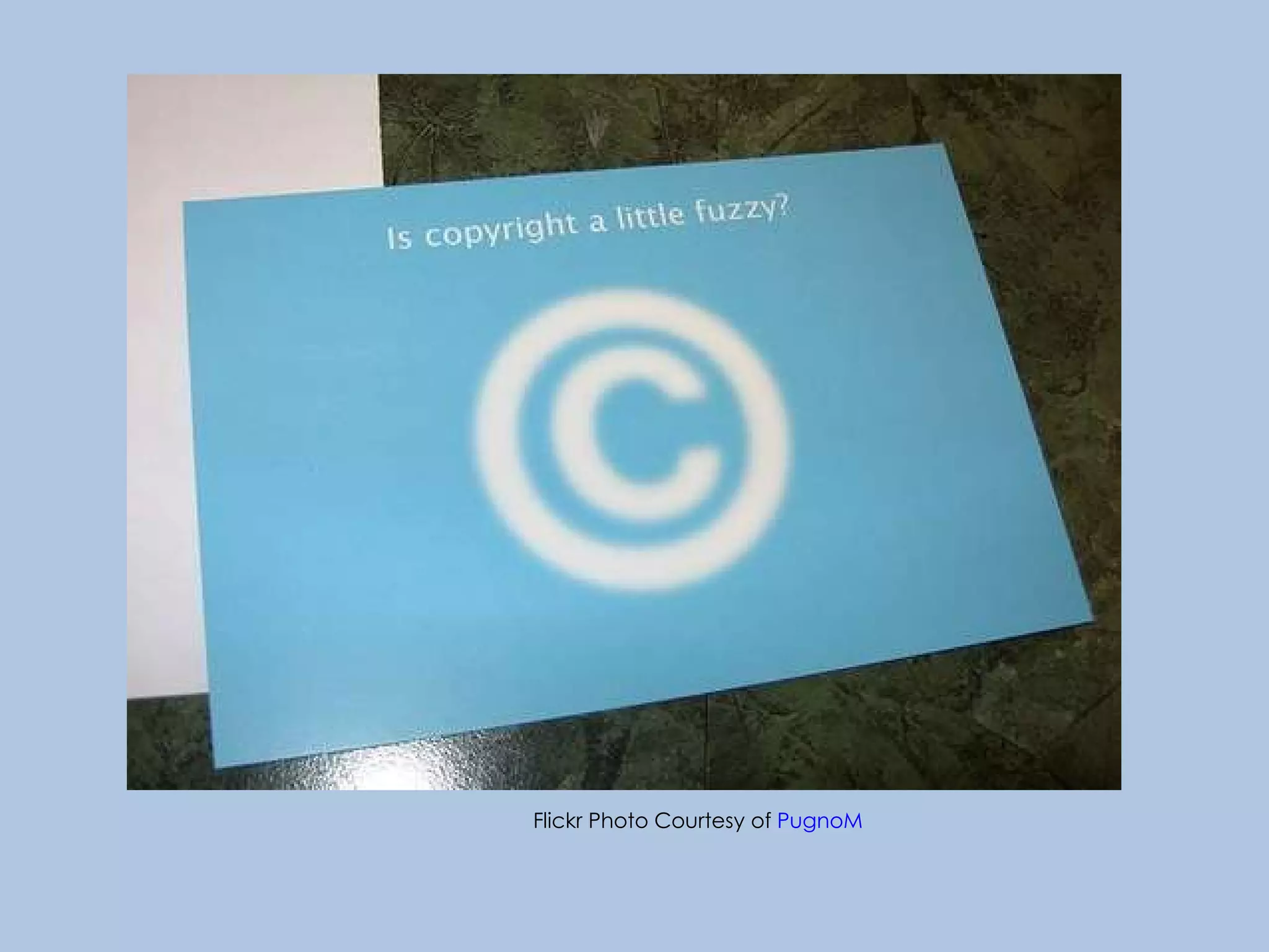 Copyright law protects original creative works and gives the creator exclusive rights over the use of their work. The first US copyright law was passed in 1790 and currently protects works for the lifetime of the creator plus 70 years. Works covered by copyright include literature, music, films, photos and more. Fair use provisions allow limited use of copyrighted works for purposes like teaching without permission. Creative Commons licenses provide alternatives to traditional copyright that allow some rights to be reserved.