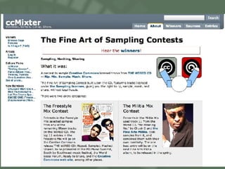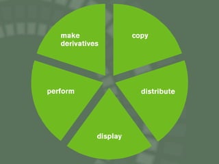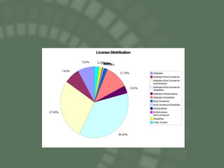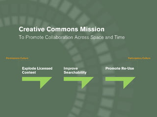Creative Commons is a non-profit organization dedicated to expanding the range of creative works available for others to legally build upon and share. It has offices in San Francisco, Berlin, and Johannesburg. Creative Commons develops standardized copyright licenses that creators can choose to apply to their works, labeling them for certain uses like non-commercial sharing and adaptation. Their goals are to promote a balanced copyright system and address issues around copyright and the Internet.