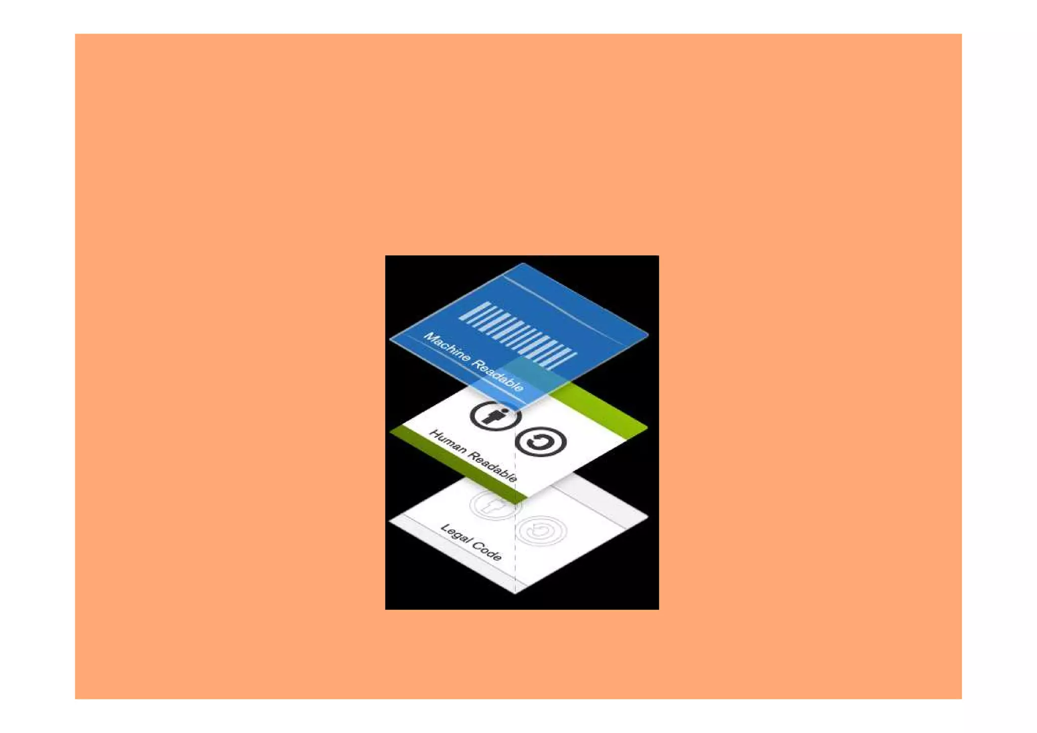 Creative Commons has three layers: the human readable layer which is available for normal people to easily understand, the machine readable layer which allows machines to know when work is available, and the legal code layer which is written in a language that lawyers understand.