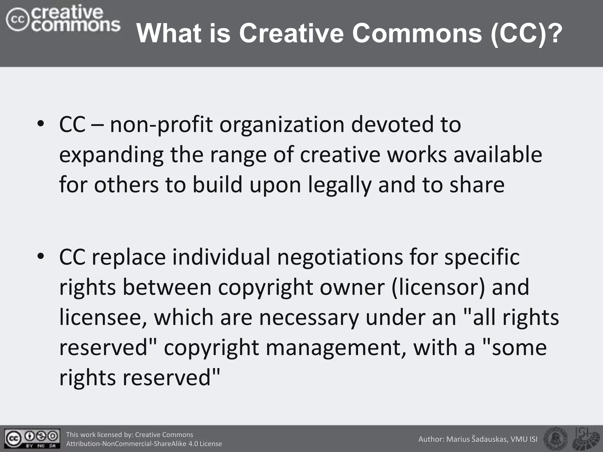 Creative Commons (CC) is a non-profit organization that provides free copyright licenses to allow for greater sharing and use of creative works. CC licenses provide alternatives to traditional "all rights reserved" copyright by allowing creators to reserve some rights while allowing others. The first CC licenses were released in 2002 and have expanded significantly since, with an estimated 500 million works licensed by 2012. CC licenses allow various rights for others to use and build upon creative works, as long as they provide appropriate attribution to the original creator. There are six main CC license types that combine different permissions for commercial use, modifications, and sharing of derivatives.