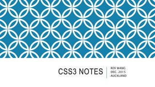 This document contains CSS3 notes from Rex Wang from December 2015 in Auckland. It lists over 20 references to CSS topics on w3schools.com including fonts, tables, positioning, box model, and CSS3 properties. The notes cover basic CSS syntax and selectors, how to insert CSS, background properties, borders, margins and padding, width and height, text and link styling, lists and tables. It also covers the box model, outlines, layout with the display property, and different positioning methods.