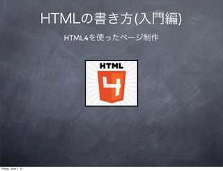 ページのタイトルを記述する ヘッダーの中に記述し、そのページを表すようなタイトル名にする。 <html> ! <head> ! ! <title>ページのタイトル</title> <meta name=”description” content=”ページの概要”> ! </head> ! <body> ! ! ページ内容 ! </body> </html> Friday, June 1, 12