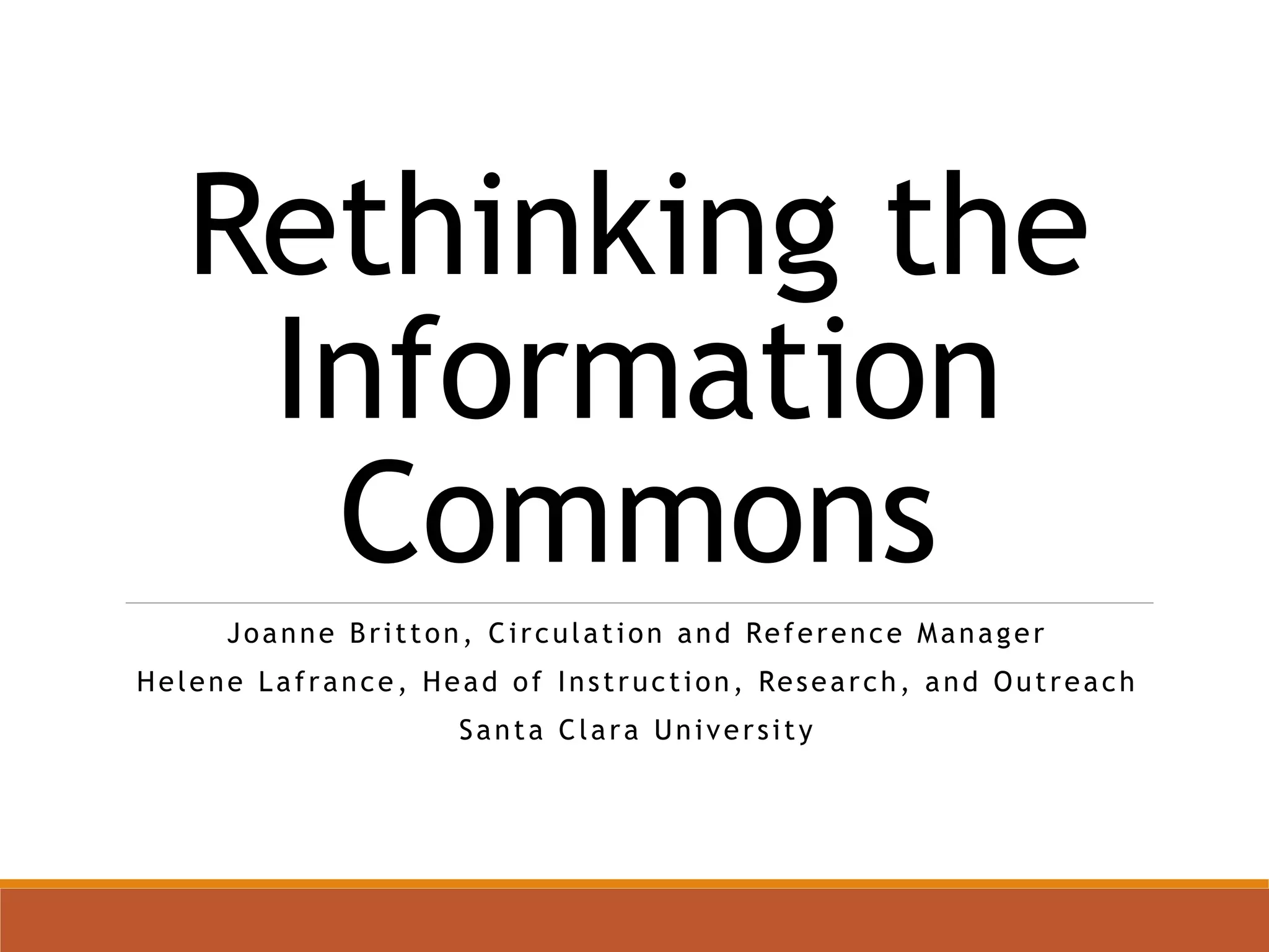 The document discusses the evaluation and renovation of the Information Commons at Santa Clara University to better meet the needs of students and faculty. A comprehensive assessment revealed that users were confused about services, wanted more collaborative spaces, and required additional equipment, leading to recommendations for significant changes in layout and offerings. Following approval, architects were hired, and implementation began, aiming for completion by summer 2015.